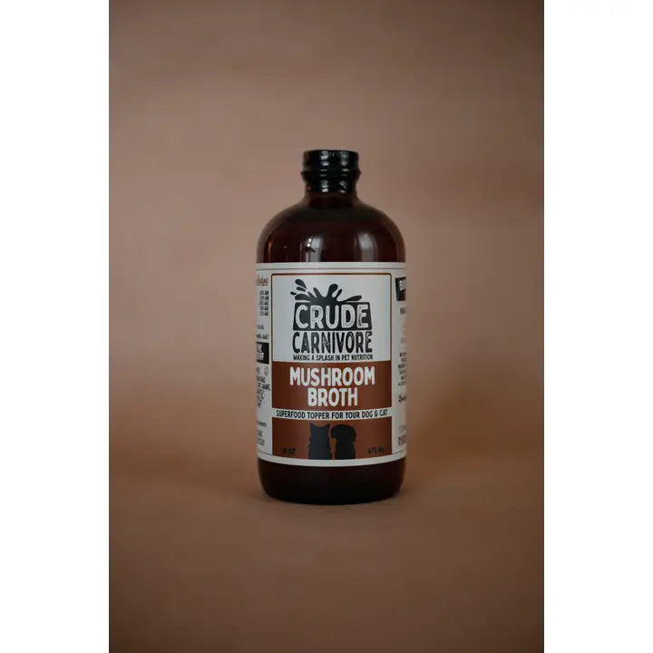 Our Mushroom Broth is bursting with powerful mushroom goodness, alongside healing herbs and nutritious vegetables. They all come together to nourish your dogs body and mind. We use a happy blend of functional mushrooms like Shiitake, Lion's Mane and Oyster mushrooms to provide the ultimate immune boosting combination while also supporting cognitive function, skin and coat health, gut stability and promoting longevity! Adding this to your dog's wellness routine to support they daily functions! Guaranteed Analysis Crude Protein 0.17%, Crude Fat 0.12%, Crude Fiber <0.35%, Moisture 99% max, Ash 0.15% max, 1 kcal/oz Ingredients: Water, mushrooms* (shiitake, lion's mane, oyster), carrots*, celery*, garlic*, parsley*, kombu, thyme*